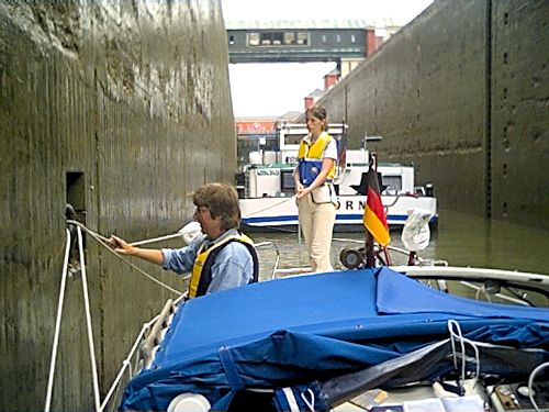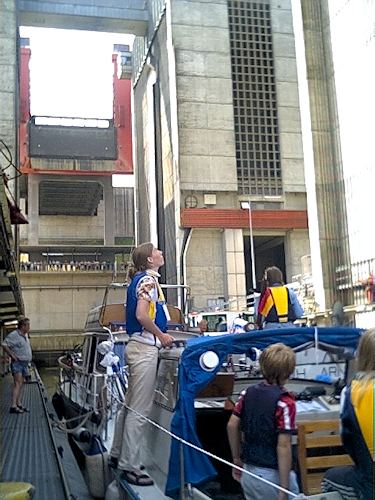 Väl nere i botten på slussen är det bara att ta det lugnt och vänta tills pråmen