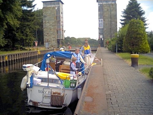 möter vår första sluss i Büssau, vi blir totalt 12 båtar innan slussen