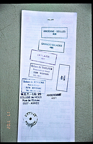 Jag tar skeppspapper och de dokument vi fick vid första sluss i Belgien och går