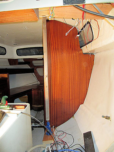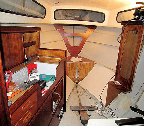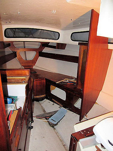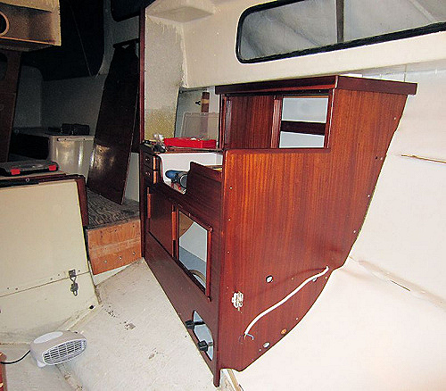 Skott, hyllor, kojinredning i främre salongen har kommit på plats.