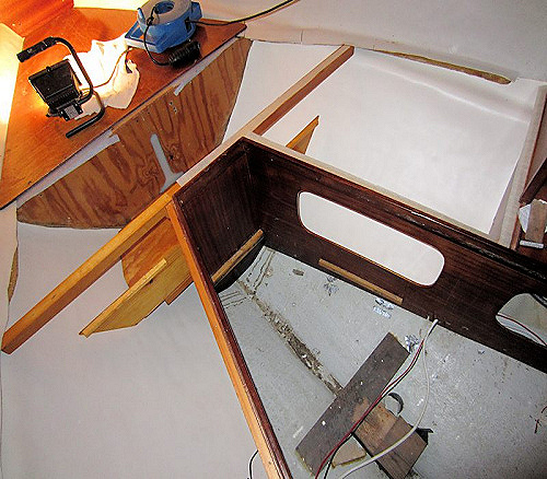 Jag lyfte då med domkraft mellan skrovbotten och rufftak och båten fick
