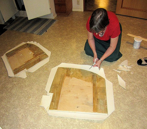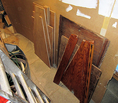 Sågat plywoodbitar, som ska bli nya durkar i salongen och förarplats