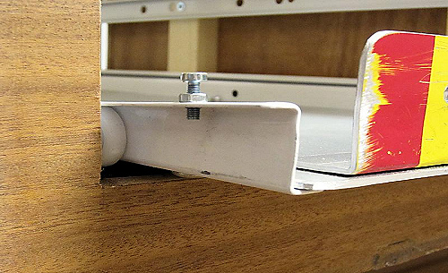 borrade o gängade jag 3mm hål i glidlisten på lådan och skruvade